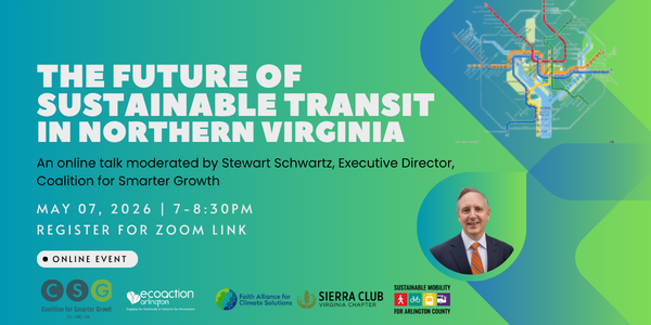 This event is co-sponsored by Coalition for Smarter Growth, EcoAction Arlington, Sierra Club Potomac River, Faith Alliance for Climate Action and Sustainable Mobility for Arlington.